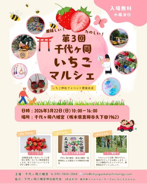 「第3回 千代ケ岡いちごマルシェ」が22日、久下田の千代ケ岡八幡宮で開催されます!